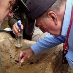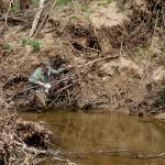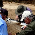 After about a 20 minute hike, we reached the creek. As usual, it looked a bit different than last time we were there. Since our monitoring location is just over a mile upstream from the Meramec River, it floods regularly, which changes the flow dratically. Mike and Mike did a quick assessment and decided on a few locations that would work for taking out samples. We had to try a few before we found three that would work. Some spots looked really nice, but once we got in them, they were either too deep or they had a sandy, very unstable bottom and we would quickly sink into the sand. Almost alost a couple guys, but we were able to save everyone before they completely disappeared into the “quick” sand.
