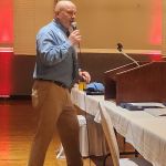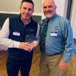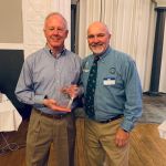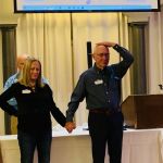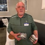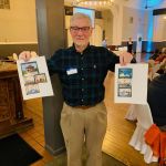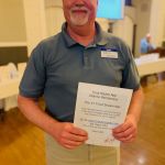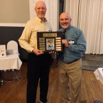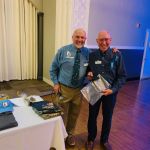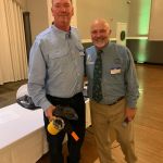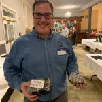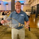 After dinner everyone had time to finish buying their raffle tickets and put their tickets in the bags corresponding to the gifts they would love to win. Our 2022 FATC awards were next. Jim Craig was presented the Miles Meyer Fly Fishing Tournament plaque (which he gets to keep for a year). Our FATC awards were won by Bob Hassett (Lew Smith ‘Spirit of Fly Fishing’ award), Harold Bates (Bob Chott ‘Servant’s Heart award) and Brian Yost (The Chairman’s ‘Going Above and Beyond’ award). All three were very deserving recipients. Then things got a little lighter as Kenny introduced the “heads/tails” game to all. Denny Garner outlasted the rest of the crowd to win a dinner and a beautiful fly-fishing frame of Kenny holding a massive fish! I am sure he will change that picture out! The top thirty raffle had six men who signed up early for the dinner go home with some gifts thanks to the Mayfly Project.