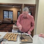 The rest of our crew consisted of Steve Darr and Chris Friesen, both first-timers, Denny Garner, and Vernon “Cookie Man” Preston. Normally, the newbies get potato peeling duty, so I had Chris jump in on the potatoes. Since there were already two people on potato duty, I had Steve take a giant leap for a first-timer and mix the meatloaf. Harold jumped in to help Steve finish them up, get them on the baking sheets, and check to be sure the loaves were shaped the way Mike had taught us. Meanwhile, Vernon baked up multiple batches of cookies while Paul took care of the green beans and rolls and kept me on target. The most important part of this meal is the gravy. Denny took over the gravy like a pro. Stirring and checking to be sure it was perfect.