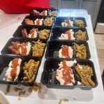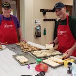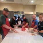 Mike Bisaga gave me about 5 different meal ideas 3 years ago when I started to lead because I’m not a cook and had no idea what or how much was needed to feed the approximately 40 people Ronald McDonald House recommended we fix for.  For the first meal we tried the cowboy meatloaf(called because it’s spiced up w BBQ sauce), mashed potatoes and gravy, green beans, rolls and chocolate chip cookies.  It was a hit and we’ve stuck with it ever since.  The dinner make up is always varied as we never know how many people are actually going to dine at the appointed 6:00 time because many are still over in the hospital with their sick children.  One time it was a full room (approximately 35 men women and children) to last night when it came time to serve no one was there but then a contingent of about a dozen from what looked like the same families just walked silently thru the line w paper plates and piled food on, wrapped them in foil and headed back up to their rooms?  Then I remembered some of these families come from out of the country with very sick children and are just trying to survive in a strange environment so who am I to judge?  Over the next 1/2 hour more people came and ate and then as things quieted down we made our plates, ate and continued to clean up when a young couple from Illinois came in with their young son and explained they had stayed as long as they could w their daughter over in the hospital before returning.  We were in the process of making up extra meals to leave in the community refrigerator so we hurriedly helped them make up plates.  They were so appreciative and bragged that over the months they had been staying this was by far the best meal they had been served.  Watching them eat and come get seconds with smiles on their faces chatting about how they had never had such delicious meatloaf made the evening a true success.