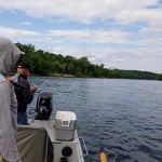 The next morning, we met our gillie (guide Brock Dixon, Terry’s wife’s 2nd cousin, from North Arkansas Troutfitters) back at the Wildcat access put-in on a cool and calm overcast morning. We got rigged up and headed out in the jet boat. Within 60 seconds after the first cast, Kenny hooked up and within a few more seconds we had our first of literally countless “doubles” on the trip. We fooled one rainbow after another and netted around 40 fish within the first 2 hours! River flows were low and ideal for catching until late in the afternoon. We fished only caddisfly larvae and midges the whole trip – because that’s what they were eating! We drifted several runs between Wildcat and the state park and grabbed a box lunch from Gaston’s White River Resort. Kenny even snuck in a nap because catching all those rainbows tuckered him out. The browns were not biting as much as the rainbows and the ones caught were on the small side. By day’s end, we netted 80-100 fish between the two of us! After fishing, we grabbed a delicious dinner at KT’s Smokehouse BBQ in Gassville. We swung over to Judicious Spirits, a Mountain Home liquor store with a great selection, and talked bourbon with some locals. Oh, and Kenny got his DQ Blizzard… Needless to say, we were full and sleepy after Day One!
