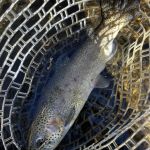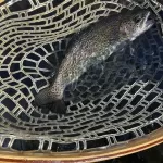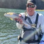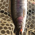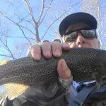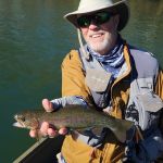 Arriving at the lake, we found perfect conditions—low flow and beautiful weather.  No sooner had we put on our wading boots did we hear the siren.  That is the warning the power company uses to announce an imminent increase in flow.  But WAIT—there were NO flow increases in the flow projection for that time.  As soon as we stepped in the water, you could tell the flows were increasing.  And so it went for the rest of our trip.  We fished Tuesday and Wednesday in the high flows, trying to find and reach catchable fish.  The higher flows made that a challenge.  Kenny Klimes joined us for the day on Wednesday.  We did catch fish Tuesday and Wednesday, but there were no consistently successful fly patterns, except maybe the Walt’s Worm, Hair of the Dog, and the Ruby 2 midge.