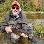 We were disheartened but not defeated and Mike decided to go deep, both philosophically and tactically.  He stated that he had never heard of a fish that read the fishing reports (clearly a deep philosophical observation), and that perhaps we should try “something unconventional”.  He then tied a tandem rig with a size 18 bead-head pheasant tail as the dropper and positioned the indicator to ensure the flies drifted deep.   As I once again approached the river, the clouds parted and the sun peeked through, which I chose to interpret as positive sign.  After several minutes of fishing, I asked, “Mike, do you think the seam I’m fishing looks good?” just as the indicator paused.  I lifted my rod tip and felt the telltale response.  The fight was on!  Several jumps and some minutes later, I had my first landlocked salmon in the net!  He had taken the size 18 bead-head pheasant tail.  I guess Mike was right…fish don’t read the fishing reports!  He measured 24” with a majestic kyped jaw.  The requisite pictures were taken and the fish quickly released.