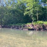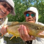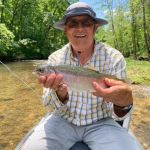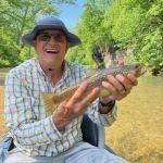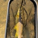 Hearing a strike downstream would tip us off as to where to aim our next cast. We used two versions of a cicada fly and we decided that a larger version with pronounced artificial wings seemed to get strikes from larger fish. But both sizes got results. And even with near feeding frenzy conditions, we had to pay careful attention to getting a natural drift. We actually only floated about five miles but netted about 20 trout and missed hooksets on many others as well. The fish were healthy and fat. The best trout, a beautiful brown, was 22” long and must have been about 6 or 7 pounds. Several others were only a few inches less.