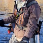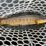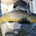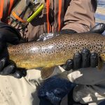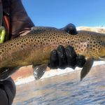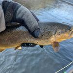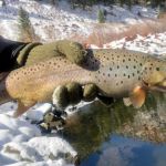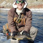 On Monday, we traveled to the Gypsum ponds on the Eagle river. We were bundled up as the temperatures dropped. We didn’t start fishing until around noon and when the sun finally warmed up the river the trout started to rise to midges and BWOs. It seemed the tinier the fly the better as fly sizes 18-24 did the best. A couple big browns were caught as you can see from the pictures. The cold wreaked havoc with our fishing all day as gloves, balaclavas and wool hats were worn. But we were not giving up – because weather reports were only going to get worse. Unfortunately, Russ Bacon received some bad news from home and had to arrange to head back home right away. Please keep Russ, his wife and family in your prayers.