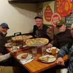 Friday was going to be a fishing day where we joined up with some of the guys from the Denver fellowship. Unfortunately, they were unable to make it, so we decided to stay close to Beaver Creek. We thought with the warmer weather predicted and the trout rising at the Gypsum ponds on the Eagle river last Monday we may do really good there when the day “heats” up. Well, with the Eagle river at lower than normal flows and the Wednesday super freeze, the river was frozen from around shoreline out to 15 feet. Also, large chunks of ice were flowing down stream. Kind of tough to fish this way. Greg and Jim went for it hoping it would warm up fast and remove some of the ice while Kenny, Ron and Al searched elsewhere to fish. They headed to check out the Colorado river again. There was very little ice on the Colorado, but the cold-water temps again made the fishing tough. Kenny caught a nice 15-inch brown on a leech pattern and that was it. So, they headed back south to find Greg and Jim. They were still fighting the frigid waters of the Eagle river and had a few big fish to the net. Jim had a couple 18-inch browns and Greg a few 16-inch browns. The entire gang fished the rest of the day on the Eagle until the sun set over the mountains and the temps dropped. Back to the lodge for more – yes – you guessed it – jacuzzi time.