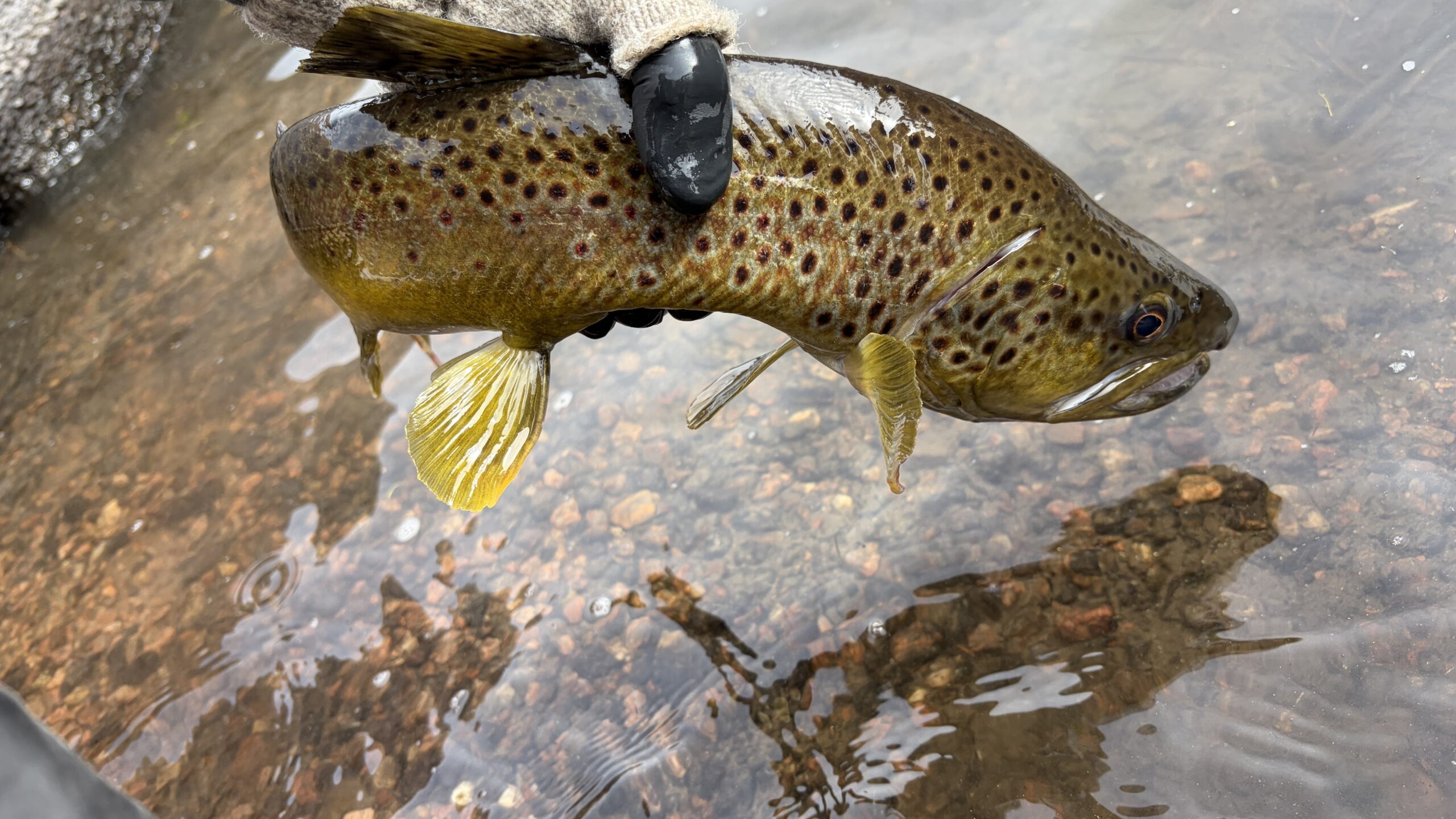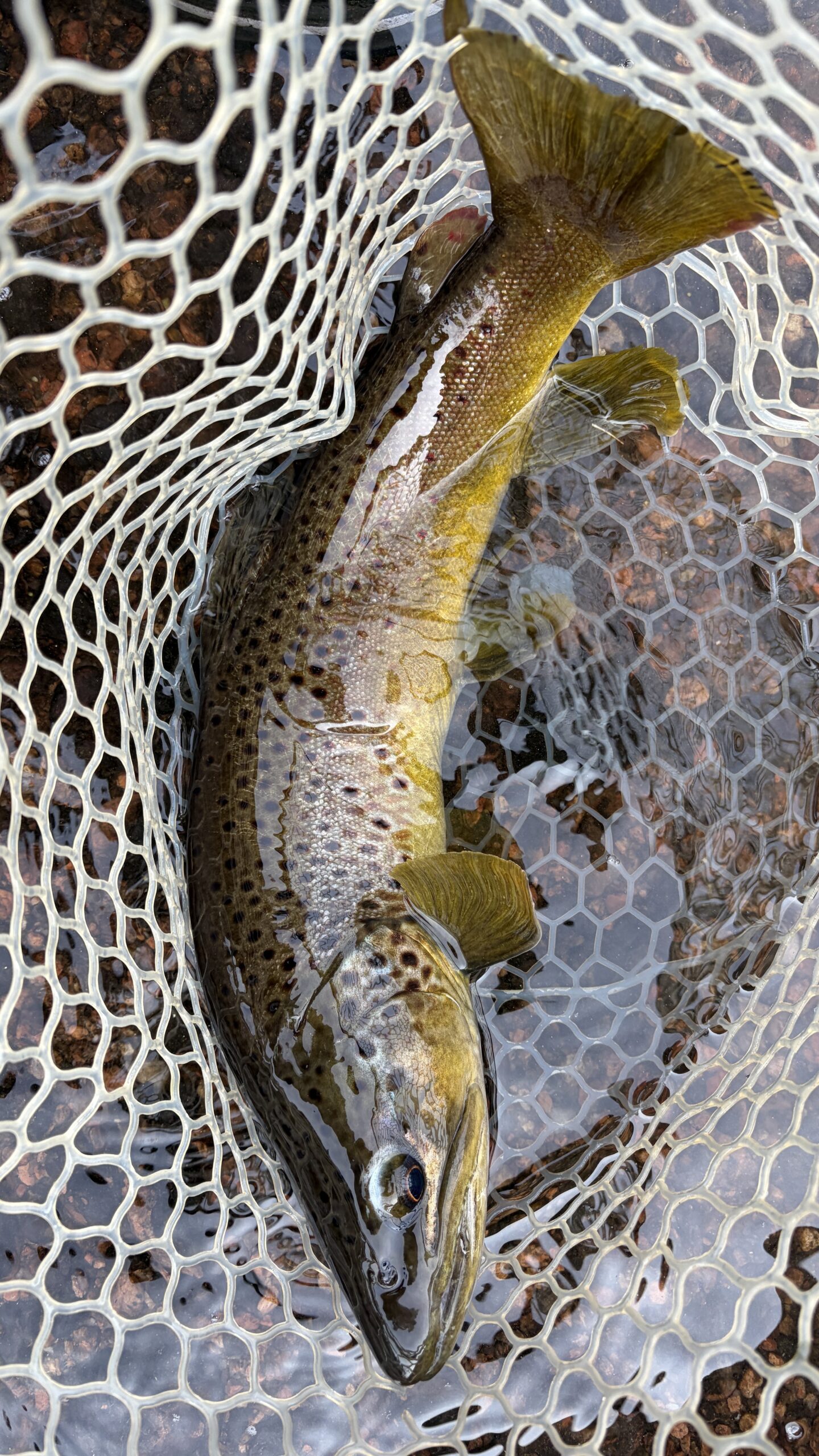 Primarily ’cuz my strategy was to streamer fish the stretch I was going to, downstream first, then nymph it back up. Never got a chance to take off the streamer!😉. Got to nearly the bottom of the run, then BAM, 20” brown followed 30 minutes later by two 12” trout. Then the wind picked up to the point of no longer viable to nymph…left at 2:45p.
