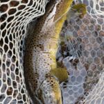 I caught this Alpha on a muted sun, high 50’s-low 60’s ambient temp day, water temp initially 35 but 39 when I caught him (42 when I left), in soft water, on a swung streamer in February. I purposely focused my fishing primarily on this water type and it paid off. This wasn’t even the mandatory catch-n-release section, so he was a true, territorial Alpha. The two 12”-ers were also in soft water on the swing, but in sections below where the big guy was hunting.