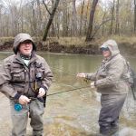 We crossed the river above the bend planning to wade from there down to Dry Creek. The first thing we noticed was that the Meramec was very murky. We could barely see the bottom at 2’. And, with the water a little higher, you had to know the exact path to cross the river, or you would end up in water too deep. We made the crossing just fine, and began fishing at the bend. We started nymphing with reliable flies–stoneflies, cerise worms, blue copper Johns, chocolate covered cherries, and egg patterns. This was going to be great. We even told ourselves that the higher flow and murky water could work in our favor because the fish would be aggressively feeding on dislodged prey, we could use heavier tippet, and the fish would be less spooky.