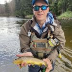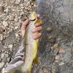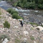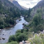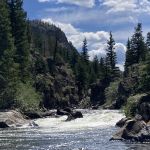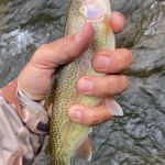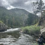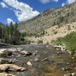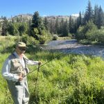 The Good, The Bad and The Beautiful! First, The Bad. The Cache la Poudre is a bit challenging to fish in that the river is lined in many places with steep banks and large boulders, and large rocks and boulders are the norm in the river. As you might imagine in the Rockies and can see in photos, the river gradient is much greater than our Missouri streams. It’s physically demanding and potentially dangerous to just work along the bank and wade. I had never used a wading staff, but now, I would not be without one in a similar river. Mike and Dan are in their early 70s, and they regularly scramble in the Poudre as their home river. To be fair, there are places where wading is much easier than described, but I did not want to mislead. The Poudre also gets lots of fishing pressure, which means fishing some of the more physically challenging stretches. The Good. Fish are everywhere, and prime spots hold nicer fish! As it turns out, the Georgia campers who paired with me could fish!!! Tim and Simon are younger guys – early 30s and mid 40s, and they covered lots of water! I could not keep up. With zero help from me, they caught lots of fish – 30+/- as their best days. They drove from Georgia! They got their “mileage worth!” While most fish were under 10 inches, we caught fish up to 15 inches. Looks like there is one photo of a bigger fish. The Beautiful! The Rockies, the trout, and the souls of good men!!!