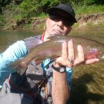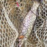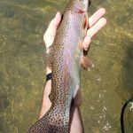 I put on a hare’s ear nymph which I thought might appeal to the fish taking emergers and a cerise worm jig that has worked well other summers. Those flies were a good guess. I started picking up fish on both. It was a pretty even count between the two flies all day. I netted 9-10 fish by the time I reached the parking lot for lunch, but only a couple browns. The only picture-worthy brown fought his way to freedom before I could net him. My afternoon production started slipping. I was growing hot and tired, and started fishing for an untold number of monkeys that kept me busy retying. I netted six fish from the parking lot to the trail out. By 3:30 the heat was getting to me and I was done. Not a bad day for following your impulse. I nearly had the river to myself on a gorgeous summer day. Next time you have the impulse—just go!