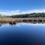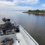 The water color often vacillates between resembling strong tea or chocolate milk depending upon how much rain has recently fallen upstream on the mainland. Generally the giant bays feature muddy bottoms and the occasional oyster beds. And many areas are shallow enough to require an outboard to be trimmed upward as one navigates close to shore.