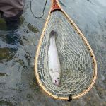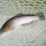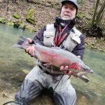 Ok, let’s get back to Walter. Jim Craig, who has been with the FATC for two years but has become addicted to the ways of the fly fisher, threw a son of San Juan into the dark waters of Walter’s stretch (where else would Walter live?). A strike!! The fight was on. Jim’s first thought was how am I going to land this thing! But he did and it was hanging half way out of his net. An elderly couple happened to be near him to take some pictures. Al was downstream from him but all he could do was say, “Wow, Oh My!!”.