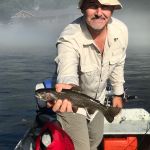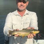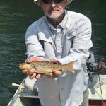 We ran into a few guide boats during the week. They were targeting both shorelines with hopper patterns. Their fishing was slower, but they did catch some very nice browns. The fly had to be placed very tight up against to shore, and usually around structure, downed trees or boulders. Since our boat did not have oars, we couldn’t safely maneuver the boat that tight, so we ended up spin casting to the shore.
