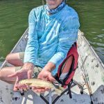 It became evident quickly, that fly fishing would be very difficult. We made the decision to switch to spinning gear, until we felt more comfortable on the high water. The switch paid off quickly, as we targeted the east shoreline with small spoons, Renegades and Little Cleos. We floated down to the Hwy 62 bridge, roughly 5 miles. We ended up with 12 trout, to include Mike’s first brown trout.