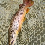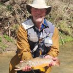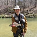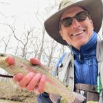 We left the water for lunch with the guys and got the latest information on what flies were hot and which locations seemed to be the best. Not many fish were caught in the morning hours by the others. So, we were all looking for a better afternoon. Jim took Raul below the cable for his first time out there. Raul caught 3-4 trout but later said it was tougher outside the park – so true. You have to be “on your game” when outside on the Current River. Funny story – Raul asked Jim if he ever falls in. Jim responded with, “I haven’t fallen in a long while, so I guess I’m due”. Two minutes later Jim went down hard. Just goes to show you we are always “Due”!! Of course, he blamed Raul for mentioning it earlier! BUT Jim did get a 19-inch brown to raise his spirits.