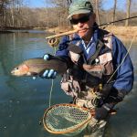 Jim Franke and Dave Beerbower decided to take advantage of a beautiful day to fish at Meramec Springs. We started a little later than most, and started at the pool side of the island. There were lots of fish suspended in the water column, but not real active. Jim had his Montauk angel fly and Dave started with a size 22 Barr’s Emerger. We were able to sight fish and that was necessary because the takes were so subtle that the line never moved. If you saw the fish move erratically or turn, set the hook! Once we figured this out the catching was on. One of the best mornings ever for me, and Jim did well too. Several fish sized 16-18” were caught. After lunch, things slowed down for a while. I caught two smallies down by the first big dam and Jim caught some further downstream on his special fly. We ended up in the island pool, and this time, dry Caddis flies were doing the trick. What a way to end a great day. This was a most satisfying day because we were able to flourish using very difficult fishing techniques. Finished the day at the chicken barn in Bourbon. Memorable. And they say you can’t catch fish in the island pool……