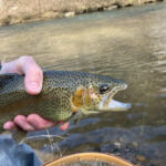 After noticing surface activity in the early afternoon not far down from Baptist Access, I experimented with dry flys until I successfully “matched the hatch” (a fly with green thorax seemed to be the key) and I had a wonderful time catching about twenty that rose to the fly. But again, while numerous and hungry, trout would refuse even the right dry fly unless it was presented with care. A soggy dry fly or one with an unnatural, forced drift resulting from careless line handling was usually refused.