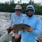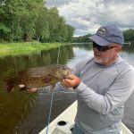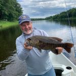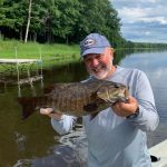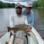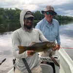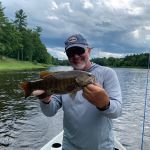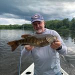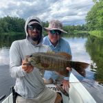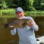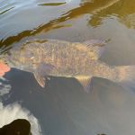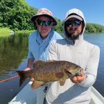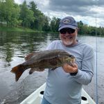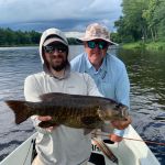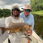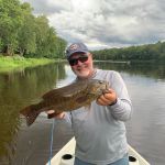 Our last day we were confident that the smallmouth HAD to eat sometime! Gabe took us to a section of the river called the “Lower.” We started out with poppers and went to streamers and then back to poppers. We tried every color popper and decided to try white this time. White poppers are rarely used on the Menominee River and I am not sure why. But not anymore!! After lunch, the clouds came in, the winds were light and the smallmouth got “Hangry.” BIG smallmouth started to “suck” down the poppers. No splashing or explosions just sucking them down. We would throw the popper, pop it once and wait. We had 16 inch to 19 ¾ inch smallmouth in the net. Could not break 20 inches. But that’s ok cause any smallmouth above 17 inches is a VERY NICE smallie. Check out the few pictures we took.