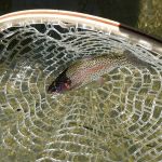 After lunch, the wind had picked up a bit and we were noticing quite a few grasshoppers flying around as we made on way up the path back to the river. We both decided to try some terrestrials. Bill worked a beetle and I decided to try a grasshopper. Things finally got active and we both began to catch fish. As the afternoon progressed, we were forced to try some other flies. I worked an olive bead-head wooly bugger and also swung some soft hackles. I had a few takes, but did not bring them to the net. Bill went with a Cerise Worm and began to have some success. He was using some weight to get the worm down and was fishing it under an indicator. He was having limited success until he saw that the worm was resting on the bottom and saw a trout coming to investigate. He was on! Then he remembered what the other fly fisherman told us earlier that morning about how he was letting an egg pattern sit on the bottom and the trout were taking it! Bill decided to remove his indicator and began to let the worm swing downstream and let it just sit on the bottom. He could see the trout get excited, investigate, and then take the Cerise Worm! He was on to something and caught several fish that way until the end of the afternoon.