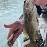 The next day, Thursday, DanStag and AL put back in at the visitors center for the 2 mile float to Cold Creek. Between the visitors center and bridge over US 63  there are some good spots which yielded trout. AL seemed to do well with his streamers, especially in an area with big boulders, and where the bank dropped off into deeper water. Once we floated under the bridge, something truly remarkable happened.  DanStag tossed out a yellow sparkled streamer, and hooked into a decent smallmouth (maybe 14” long) which put up a good fight. As we netted the fish, we noticed the caught fish had a fish tail sticking out of its mouth, in addition to having taken the fly.  Pulling on the fish tail and out came a partially decomposed/digested 5” sculpin ! We got some pictures before releasing the smallmouth, and put the sculpin back in the smallie’s mouth.  After all, who wants to have food taken from their mouth ? It seemed in-humane to do other wise.