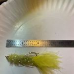 DanStag tried a couple of different approaches: 1) using heavy flies (a chartreuse mop fly with a BS Killer dropper) under a fairly large indicator. This helped a some, but many bites were missed since the take was not hard enough to noticeably jostle the indicator. A 12 inch smallmouth and 2-3 stocker sized trout were taken this method (uh, and a bluegill). 2) Later stripping a streamer under full sink line was a bit more successful. Wind was still a huge challenge since it was blowing upriver in one’s face. A few more fish were picked up on a Clouser minor (first time using it) and a brown leech.