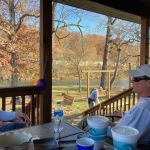 Each evening we enjoyed a fellowship happy hour on the deck, just a stone’s throw from the stream. Monday we were treated to yummy pasta and salad dinner, followed by apple or cherry pie with cinnamon ice cream provided by “Hazmat” McClure.