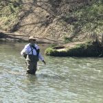 The second day (Wednesday) we were joined by Mike Oldani. We had a crockpot breakfast at the campground and then most of us made it a “float” day, leaving Dam 3 access and floating to Riverside campground. A great day sunny, cool breeze, good water movement and pretty good fishing at the various places we stopped. Most of the stretches of the river have “football” to “cooler” sized boulders which can be slick. The water is mostly knee to waist deep. Fish were caught on Wooly Buggers (purple or black), Euro flies, Cherise worms, white or gold-tinseled Clouser minnows and gold Spinners. During the float: as many or more fish were caught on spinners rather than fly rods, due to ability to reach more water; Spinning rod recommended for a float.