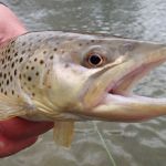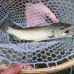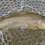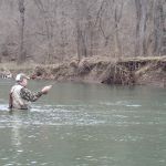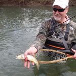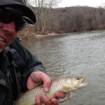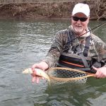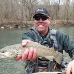 After breaksfast, Mike, Mike, Dave and Jeff decided to skip the park and headed back to the Niangua where they were the previous day. Fishing was a bit slower on Sat, but again, very peaceful. The group had a few god fish on the line, but could not get them to net. Chamber caught a sucker early on with a Cranefly(mop), but that was about it for a while and mixed success through the day for all. No real fish. As we were heading back to the car, Bisaga decided to try a spot he had focused on the day before. There were fish, but nothing would take on Friday. After drifting a crackleback through this hole a few times, something finally took. Turned out to be a 16+” brown. Definitely his fish of the trip.