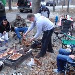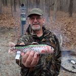 Campground was not crowded and allowed us plenty of space to spread out. The Thursday group was set up, and on the water by 2pm to see how the spring was fishing. Several of us headed to zone 1 by the spring. Unlike the campground, the stream WAS CROWDED. There were people EVERYWHERE. On top of that, fishing was tough, as we didn’t see a whole lot of people catching. Even with that, the FATC guys managed to get a few to the net. As it started to get dark, we headed back to camp for a campfire and dinner. Mike B had brought and pile of venison brats which we cooked over roaring campfire and smothered with sauerkraut. We always eat good.
