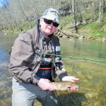 We departed on Friday morning (April 6th) without one fly fisher – Tim McCoy – who separated his shoulder the night before. Sorry Tim, we hope you are doing well. So with two cars loaded, Bill Lowry, Miles Meyer, James Mitchell, Paul Schneider and Kenny Klimes headed (the correct way) to Taneycomo. With all the rain there was no chance to fish Taneycomo so we headed for Bennett spring to fish a few hours on Friday. Bennett was fairly empty so we fished mainly up near the spring. The water was high, slightly fast and off colored so Kenny suggested go “big and gawdy” and recommended the rubberlegged stonefly. Good choice since it worked well for most. The fish caught were bigger than average – most were in the 14 inch range. As the sun went lower in the sky the temps dropped and we departed by 4pm to get to the condo in Branson. After dinner we made plans for the next day with a forecast of SNOW and cold.