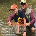 It was.  The morning led off with a tiny little white fly hatch.  Midges, Trico’s, I’m not sure, but I knew white and small should be the way to go.  Tied on a few size 18/20 light cahills and off we went.  Liam chucked it out there about 20 feet and BAMB!  The best sounds I have ever heard on a stream- “Daddy, I got one”.  Being used to small bass I had to coach him a bit. “let him run, rod high, turn him towards the net” All of which he did fantastically.  Boys, I could not be prouder of my son.  He did great.   3 more trout on the sunken dry fly and in true fashion for a 9-year-old he looked at me and said he was ready to go get his doggy Harley.  It wasn’t the most relaxing day I have ever had on a stream, but without exception, it was the best.  I have memories and pictures of my boys first trout fishing trip!