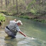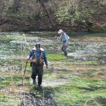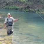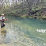 After lunch, Kenny took John to the top of the river near the spring. Many spin fishermen were up there – it looked like a spin fisherman convention. Kenny had a feeling that there was some kind of “group function” going on. But we were able to work around them with out much problem. Just remember to show good fishing etiquette even if they do not. John pulled in his graduation fish on the “blue hole” and had a few more on while we were up there. As we traveled downstream, we ran into all of our guys and most we just doing ok. Not a lot in the net but some nice trout were caught. John and I worked our way just past the boulder and stopped for the day.