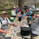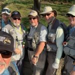 Seven fly fishers hit the river running and picked their favorite spots to fish before lunch. Kenny and John went to the usual area for the “grads” to start the day. They worked on casting, stripping flies, swinging flies and dead drifting all before noon. Kenny went over the gear to have and where to “attach” it to the vest (or body). John had a couple of hits early on but couldn’t keep them hooked so the two worked on his “set.” It seems the other FATC heard Kenny yelling, “set, set, set” instead of the “mend, mend, mend.” John got to do all of the different techniques before lunch, and we headed back up to the Stag tables at 11:30am. When we met up with the others, we all agreed that the morning was a little “slower catching” than normal.