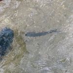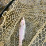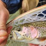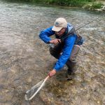 The weather was perfect all day until around 3:30pm when a slight drizzle turned not rain at about 4:30pm. All day the rain was threatening but only low clouds showed up -my kind of fishing weather. At lunch we discovered what we thought – the fishing was tough. Not sure why just don’t say there are no fish in the river – we saw hundreds. The trout seemed to want small (midges) but also took olive mohair leech patterns. Kenny caught three almost back-to-back with the rod under his arm pit while helping Bob with his dead drift. Go figure – I guess they just know him personally.