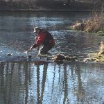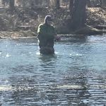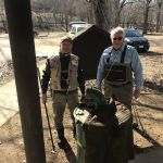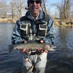 First on the agenda, was to get Bob officially graduated. Mike and Bob headed to the area right below the bridge to work on several techniques from class. Bob, having already been on the water a few times since class, had his casting skills down, so we focused on a few different techniques. Swinging a fly, stripping, and dead drifting. With several good hits early on, it was only a matter of time before Bob would bring in his first “official” FATC trout. A nice brown on a tan Woolly Bugger. Great job Bob.