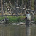 The next day we fished Firehole in the morning and the fishing here was also a little slow-at least for us. We each managed to catch one, Pete on a P&P and John on a Hare Ear nymph. We were a few weeks early for the good dry fly fishing on the Firehole. In the afternoon, we chose to try something different, for our group anyways, and fished the Gibbon river in Gibbon Meadow above the falls. We have been told that while the fish are mostly in the 10-14in range there can be some big fish hiding in spots. Pete was going to prove the latter true while John focused on catching the smaller ones. Gibbon Meadow is a beautiful spot to fish, one of our new favorites. It is oxbows and cutbanks with some nice fish hiding out. John ended up catching 5 cutbows all in the 8-12in range, on hoppers. Pete went for quality and caught a very nice Brown ~ 17in on a hopper that was near the bank in maybe 18 in of water. It was one of Pete’s highlight moments when that brown lasted his hopper. He later caught another nice brown here as well. The next day we fished the Gibbon below the falls. Unlike the previous day this section had more riffles and runs and was mostly over stone. We didn’t do well here but Pete got a really nice rainbow of about 16in in a riffle using an RS2. We later fished the Madison but as we have typically found this time of year we didn’t do very well. All in all it was a great time. Slough and Soda Butte were awesome as always and we really enjoyed the scenery and surprises of the Gibbon. We had hoped for a lot more hopper action than we had, though we did catch fish on them, it was the traditional flies we use here in MO that worked really well. Especially the Copper John and P&P.