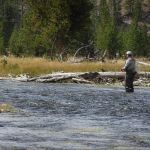 Pete Drochelman and I (John Walker) spent the week of Sept 2nd thru Sept 7th fishing in Yellowstone Park. This is the fifth time I have fished there during late August/early September but it never gets old. Pete and I started in Gardiner and fished Soda Butte and made the hike back to Slough Creek. Soda Butte fished well as is typical this time of year. To our mild surprise the fish were not very interested in hoppers but instead sat down deep the day we were there. So, we had success on copper johns, the P&P, zebra midge and Barr’s emerger. John had 2 cutthroats at 17 in and several others in the 15in range. Pete also got a couple of nice ones as well. The best fly by far was the P&P followed by the Copper John. All flies we brought with us. The next day we fished Slough creek. We took the 5 mile hike to get to the 2nd meadow giving us roughly 5 hours on one of the great fishing spots in the U.S. We entered at campground 2S1 and camping there was a group from St. Louis. Small world. Anyhow, here the fish were interested in hoppers, so it was on. John caught 8 solely on a foam hopper or Chernobyl ant he had bought on previous trips. Pete went the elk hair caddis route and caught several. In fact, his total would have been higher had he checked his fly and realized he had a busted hook. Pete also managed to catch a couple late in the day on a Copper John in some of the faster moving water. All in all that was a great day but the hike back was a little rough. Pete and I were both exhausted when the day was done. We drove to West Yellowstone the next day and fished at the confluence of the Gibbon, Firehole and Madison rivers. The fishing was much slower here but John managed to catch a couple with an x-caddis. Every evening if the sun was shining there was a strong caddis hatch but for the most part they weren’t taking dry flies here and we struggled to figure out what they wanted.