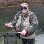 Jim and Bill had great days too as both caught plenty of fish. Bill caught his trout on copper john, cerise worm, and woolybuggers while Jim did well on the woolybugger, griffith’s gnat and soft hackle.  We didn’t travel too far in the park. Bill made it down to the last “waterfall” while Jim and I stayed pretty much in the beginning of the park.  It amazes me how such big trout will eat such tiny flies but they do.  The fishing slowed in the afternoon until about an hour before the siren.  Then Jim and I had fish on with a woolybugger and a Mayer’s black leech.  We ended at 4pm and had pizza at Missouri Pizza in St James.  Don’t miss winter fishing or you will miss out on some awesome fish.